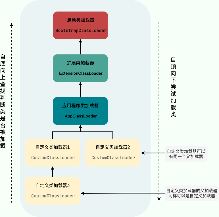 - 若该类未被加载过,当前类加载器会将加载请求委托给父类加载器去完成;